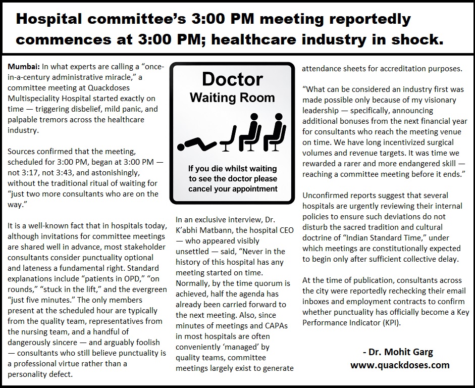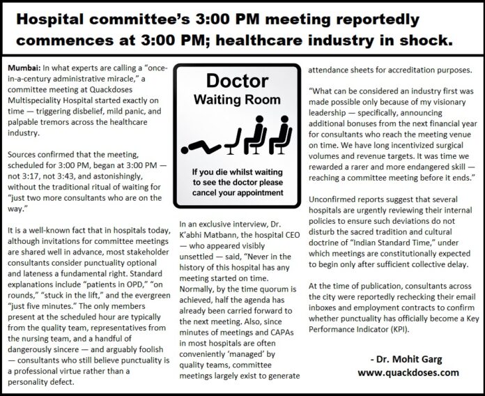 Previous articleHospital committee’s 3:00 PM meeting reportedly commences at 3:00 PM; healthcare industry in shock.